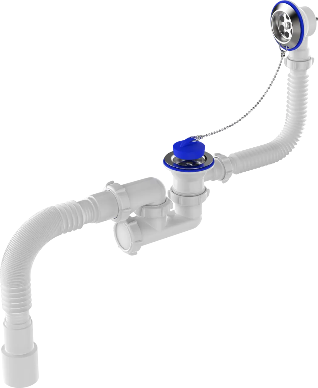 Сифон для ванн регулируемый. Выпуск с решеткой из нержавеющей стали Ø70 мм спроектирован под стандартный диаметр сливного отверстия ванн Ø50мм. Подходит для всех типов ванн, в т.ч. чугунных. Решетка крепится на винт 60мм и шестигранную гайку М6. Перелив с трубкой длиной 50см и металлической решеткой. Колено сифона регулируемое с высотой гидрозатвора 50 мм, имеет ревизионное отверстие, заглушенное прокладкой и гайкой, для легкой прочистки сифона без его демонтажа, а Г-образная трубка отвода позволяет направить гофротрубу слива в нужную сторону. Артикул идет в комплекте с гофротрубой с универсальным выходом в канализацию 40х40/50мм и прокладкой-бабочкой из термоэластопласта (ТЭП), который не вступает в реакцию в акриловыми ваннами. Пробка для перекрытия воды из ТЭПа, на цепочке. Полная комплектация, все гайки, прокладки и схема установки в комплекте. Скорость слива: 25 л/мин.