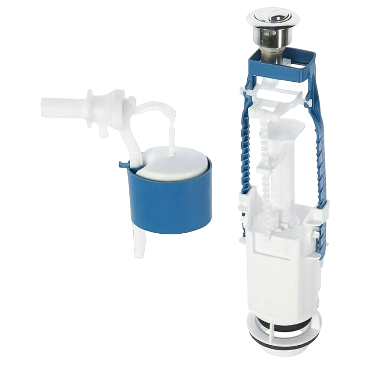 Комплекты арматуры с кнопочным двухуровневым клапаном выпуска предназначены для использования с керамическими бачками, отверстие в крышке которых имеет диаметр Ø40 мм. Металлизированная кнопка слива работает в 2-х режимах: «эконом» и полный слив.
