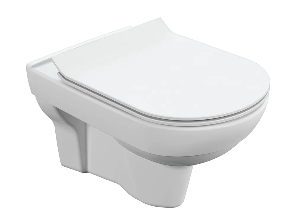 Безободковый подвесной унитаз с ультратонким, антибактериальным сиденьем с плавным закрыванием и легкосъемным механизмом.